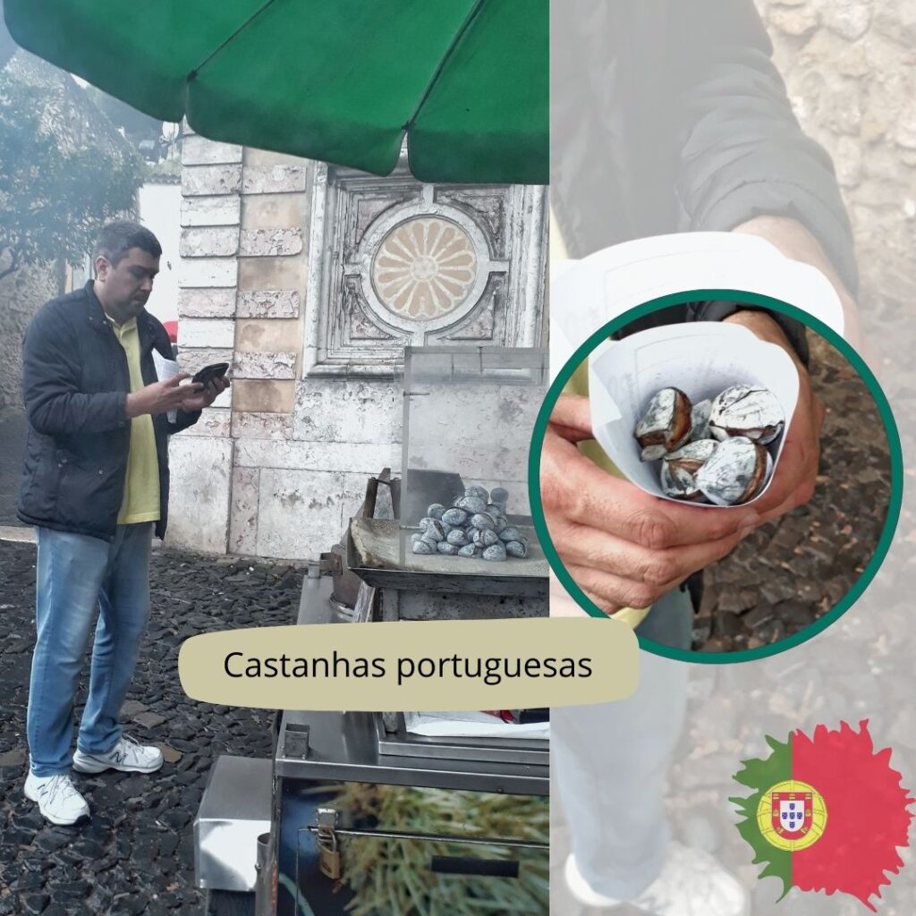 Castanhas Portuguesas: existem em outros países europeus, também. São “sapecadas”, como o nosso pinhão. E tipicamente vendidas em mercados de Natais ou em carrinhos pelas ruas.