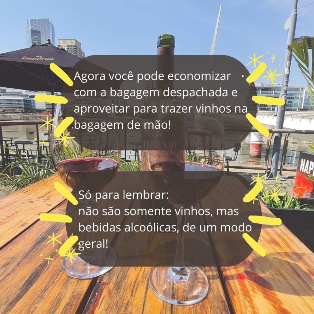 Viagem Internacional: Como Trazer Bebidas Alcoólicas na Bagagem de Mão https://www.vemviajaramor.com.br/2025/08/14/viagem-internacional-como-trazer-bebidas-alcoolicas-na-bagagem-de-mao/ Thu, 14 Aug 2025 19:14:20 +0000 https://www.vemviajaramor.com.br/?p=523 Em nossas últimas viagens para a Argentina e para o Chile já usamos esse benefício. Mas lembre-se que o vôo tem que ser direto entre Brasil e Argentina ou Brasil e Chile. Se tiver escala não é permitido, ok? Para a Argentina fomos com a Gol. E para o Chile com a Latam. Se você […]