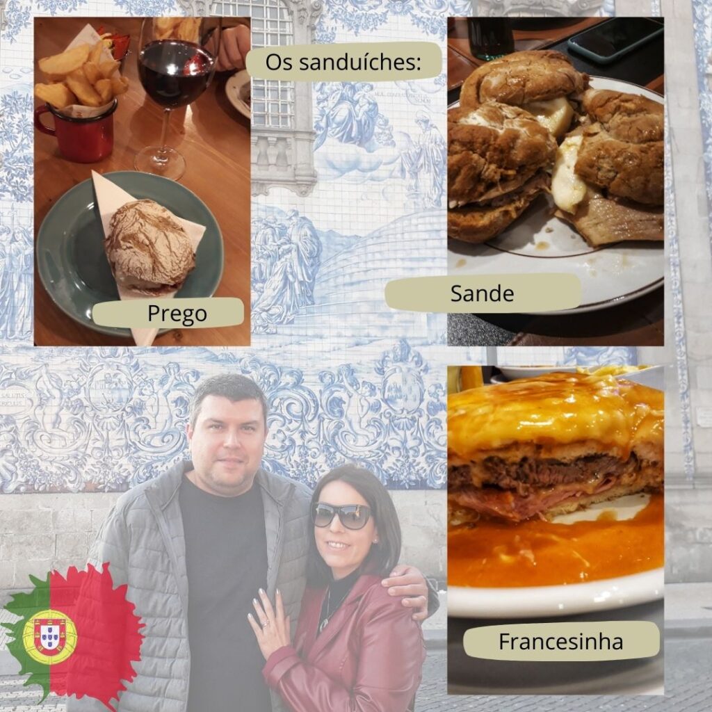 Sanduíches típicos do Porto: Sande (pernil com queijo da Serra da Estrela), a Francesinha (esse bem conhecido com um molho especial apimentado) e o Prego (sanduiche de carne com queijo)
